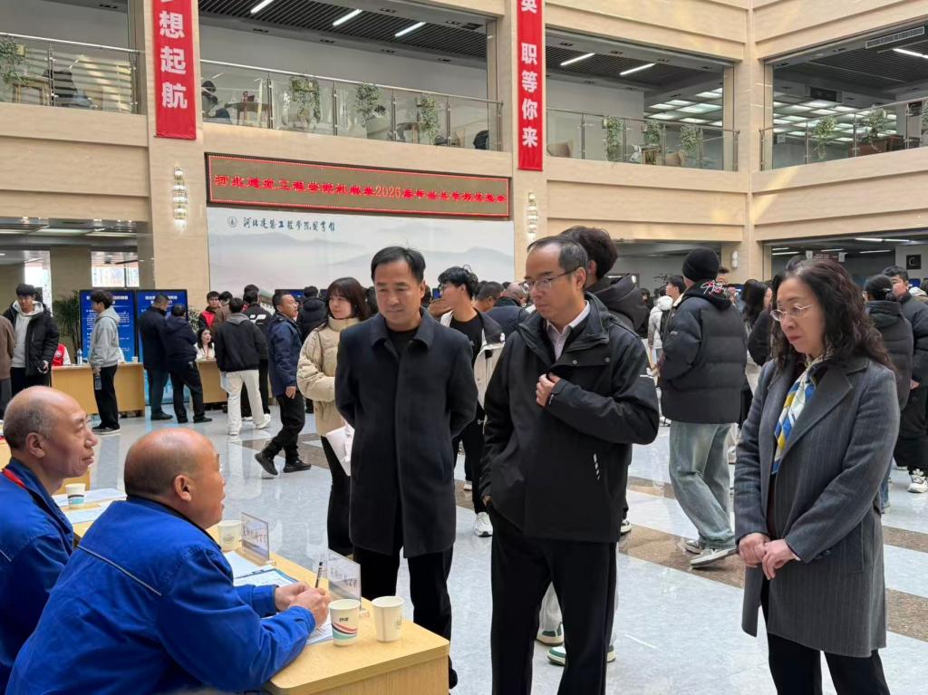 校长王建民和张家口市机械工程学会2025年学术年会参会嘉宾及学生处、机械工程学院领导来到双选会现场,与河北宣工机械发展有限责任公司、河北宣化钢铁机械制造有限责任公司、河北和歌山生物科技有限公司等用人单位就产教融合、人才培养、创新实践等进行了深入交流。领导们还参观了机械工程学院学生竞赛获奖作品和专业类兴趣小组创新作品展示,对学生的创新成果给予了高度评价。