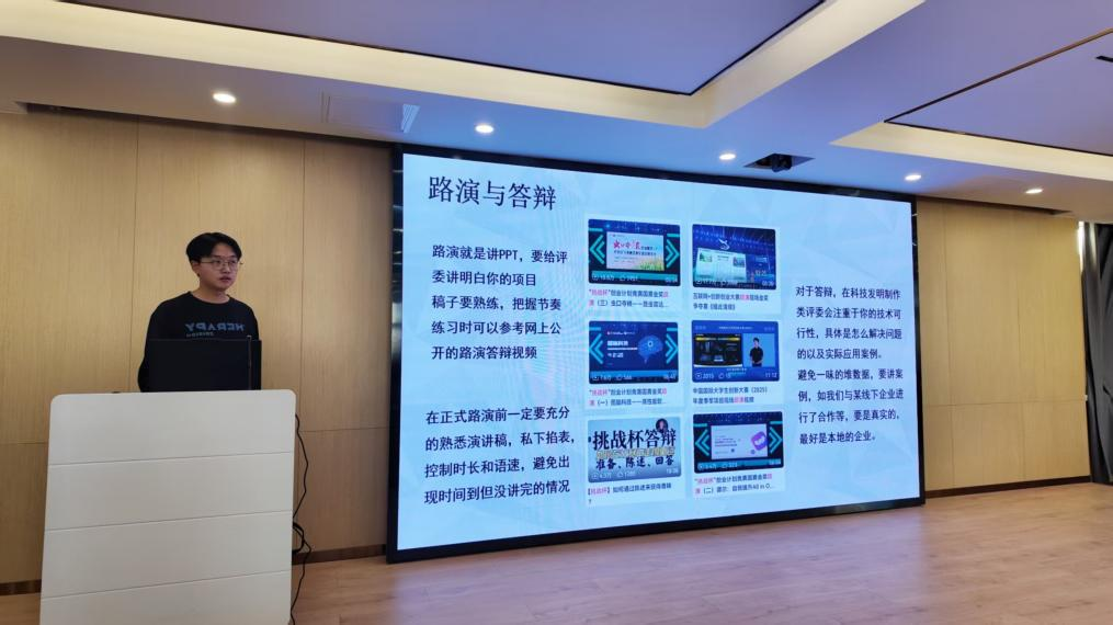 分享会上,各位优秀学生代表结合自身经历,倾囊相授,内容涵盖从项目萌芽到成果落地的全过程。在“挑战杯”备赛方面,获奖团队代表宗泰聚焦答辩展示环节,分享了“用案例叙事代替数据堆砌”“精准控制PPT篇幅与逻辑”等实用技巧,使同学们对如何高效、生动地呈现项目有了更直观的认识。成世博、祁琳琳同学则深入浅出地剖析了项目选题的生成逻辑与创新路径,提供了多元的借鉴渠道,引导同学们跳出思维定式,深入思考项目的核心价值与现实意义。