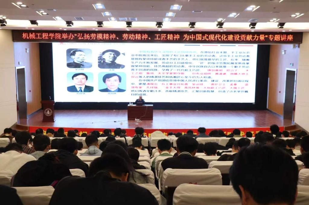 为大力弘扬劳模精神、劳动精神、工匠精神,4月22日,学校邀请2025年“大国工匠”人才称号获得者、中煤张家口煤矿机械有限公司涂装分厂厂长祁峰为我院师生作题为“弘扬劳模精神、劳动精神、工匠精神,为中国式现代化建设贡献力量”的专题讲座。讲座由机械工程学院举办,400余名师生到场聆听。